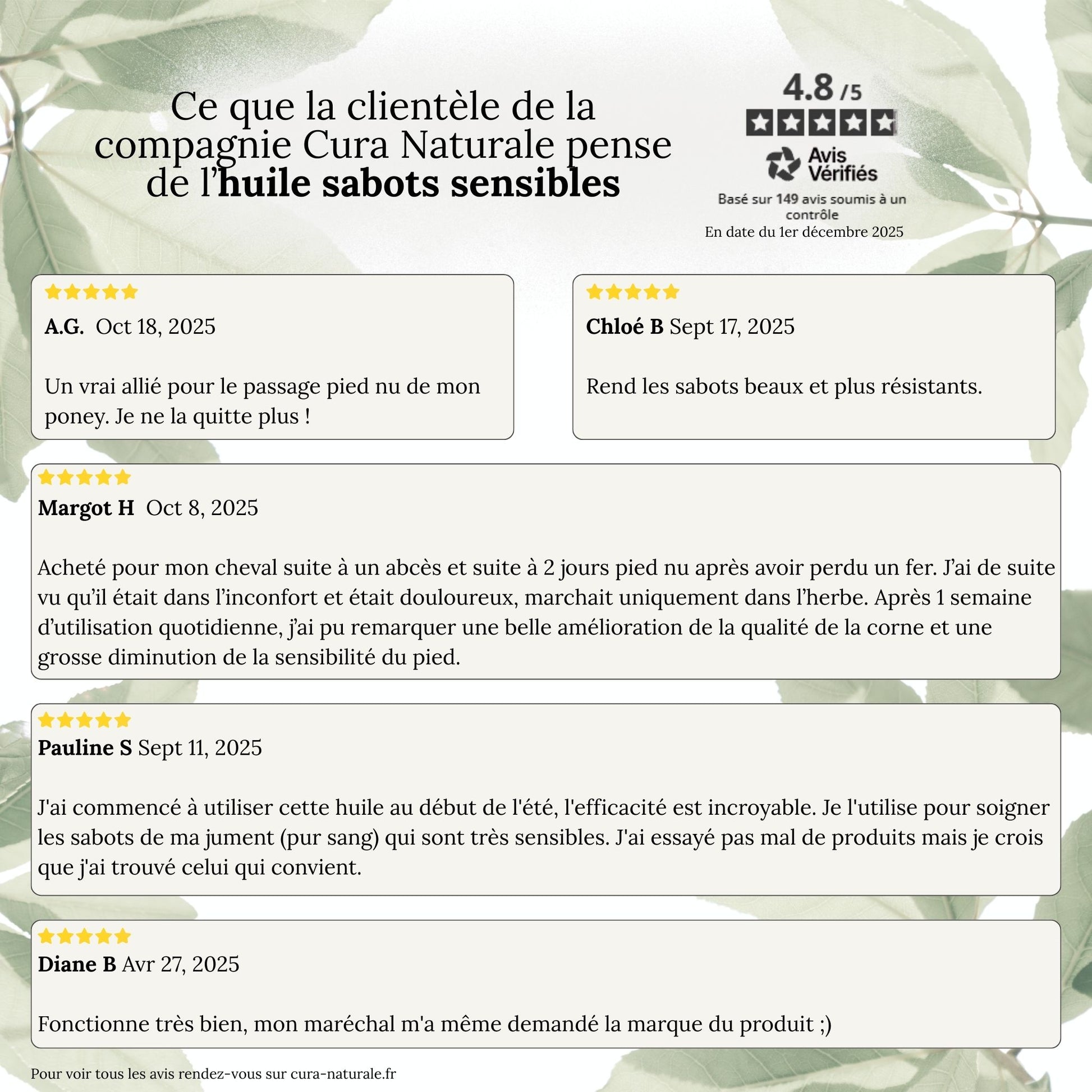 Huile sabots sensibles Cura Naturale, soin naturel destiné à nourrir, assouplir et protéger la corne du cheval. Idéale pour les sabots secs, fragiles ou présentant des éclats superficiels, ainsi que pour accompagner la transition vers le pied nu. Formule végétale à base d’huiles naturelles et d’huiles essentielles, conçue pour soutenir l’hydratation, l’élasticité et l’aspect du sabot. Disponible chez ChevalEssence.